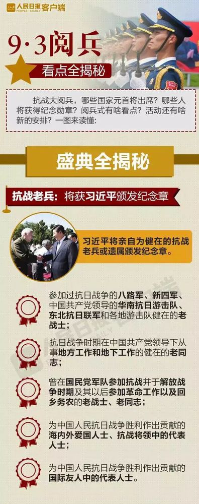 9.3大閱兵在即!屆時,北京天安門地區(qū)及長安街沿線將舉行盛大的閱兵和慶祝活動。國家主席習(xí)近平將如何向老兵致敬?哪些國家政要將出席閱兵?我軍又會有哪些先進武器裝備亮相……